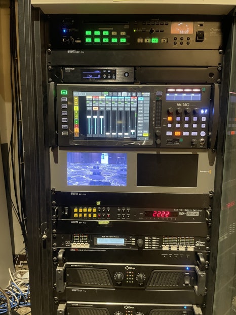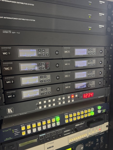 우리는 기존의 비효율적인 시스템을 걷어내고, 베링거 윙 랙(Behringer WING RACK) 디지털 믹서를 도입했습니다. 과거에는 EQ, 컴프레서, 이펙터 등을 사용하기 위해 거대한 랙 캐비닛이 필요했지만, 윙 랙은 이 모든 기능을 4U 사이즈의 본체 하나에 내장하고 있습니다. 좁은 음향실 공간을 효율적으로 활용하면서도, 터치스크린을 통해 각 채널의 음색을 정밀하게 제어할 수 있는 올인원 솔루션입니다.